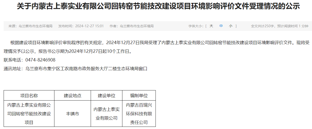 2024年12月27日,烏蘭察布市生態環境局受理內蒙古上泰實業有限公司回轉窯節能技改建設項目環境影響評價文件并對外進行公示,公示期為2024年12月27日起10個工作日。