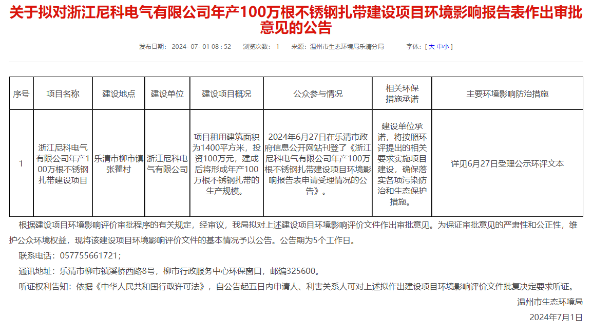 7月1日,溫州市生態(tài)環(huán)境局樂清分局就浙江尼科電氣有限公司年產100萬根不銹鋼扎帶建設項目環(huán)境影響報告表作出審批意見并對外進行公告,公告期:5個工作日。