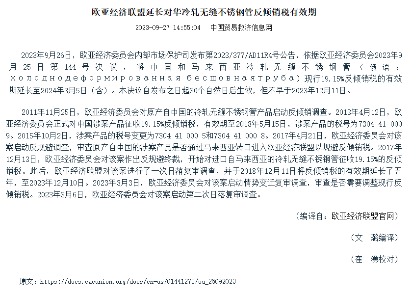 9月28日,據中國貿易救濟信息網一則公告《歐亞經濟聯盟延長對華冷軋無縫不銹鋼管反傾銷稅有效期》稱,“2023年9月26日,歐亞經濟委員會內部市場保護司發布第2023/377/AD11R4號公告,依據歐亞經濟委員會2023年9月25日第144號決議,將中國和馬來西亞冷軋無縫不銹鋼管現行19.15%反傾銷稅的有效期延長至2024年3月5日(含)。本決議自發布之日起30個自然日后生效,但不早于2023年12月11日。”