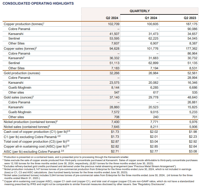 當地時間7月23日,第一量子(First Quantum)公布2024年第二季度報告。
