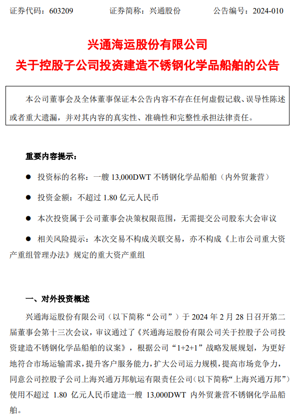 興通股份:子公司擬不超1.8億元投建不銹鋼化學(xué)品船舶